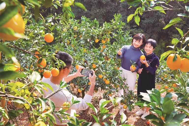 农旅融合进一步拓宽了增值路径。在关西镇翰岗村,龙慧栖乡宿老板徐春华忙得脚不沾地:“这两个月来赏围屋、摘脐橙的游客特别多,他们住民宿时常会顺带买脐橙、石斛花茶。”乡宿周边配套了林下石斛、梅花鹿养殖、百果园等产业。去年,龙慧栖乡宿营业额达300万元,带动农副产品销售33.5万元、村集体增收24.3万元。