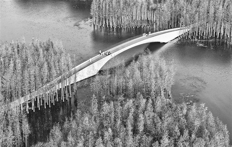 南昌鱼尾洲公园成片水杉换上“红妆”,倒影实景交织,市民穿梭林间,宛如会动的山水画,尽显诗意。图为1月6日,市民漫步其间,感受惬意时光。本报全媒体记者 徐 铮摄