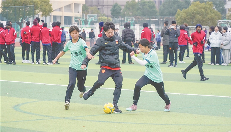1月5日,中国国家男子五人制足球队与马尔代夫国家男子五人制足球队走进定南校园开展公益活动。图为国家队队员正在与定南县小队员热身。这场近距离的互动不仅让孩子们体验足球魅力,更点燃了他们的足球梦想,为校园足球发展注入蓬勃活力。郭水华摄