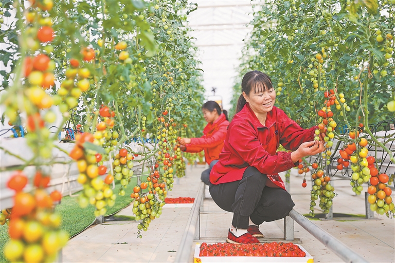 近年来,瑞昌市通过运用“大数据+人工智能”等智慧农业模式,带动产量与效益同步增长。图为1月6日,瑞昌市高标准设施蔬菜示范中心内,工人正忙着采摘西红柿供应市场。特约通讯员 魏东升摄