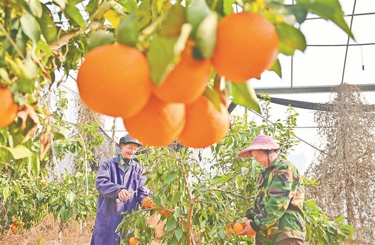 抚州市东乡区大力发展现代设施农业,积极推广大棚果蔬绿色有机种植技术,提高农产品经济转化效益,实现农业增效、农民增收,助力乡村振兴。图为近日虎圩乡下邹村果农在大棚里采摘红美人柑橘。