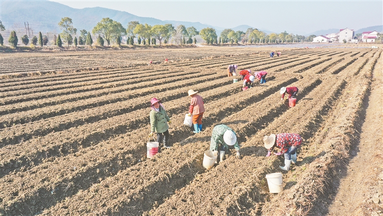 1月5日,永丰县瑶田镇秀元村农民在田间种植槟榔芋。近年来,当地通过土地流转实行规模经营,推动特色产业提档升级,带动农民增收致富。
