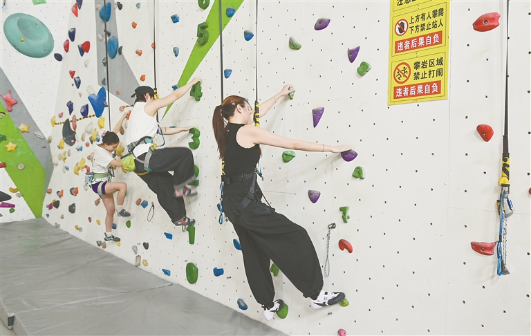 1月6日,在南昌市红谷滩区一家攀岩俱乐部,几名青少年正努力向上攀爬,尽享攀岩运动的独特乐趣。攀岩运动被誉为“峭壁上的芭蕾”,集健身、益智、娱乐、竞技于一体,如今成为不少青少年的运动新选择。 本报全媒体首席记者 李 劼摄