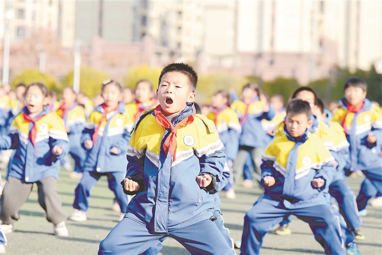 近年来,上高县锦阳小学将传统武术引进校园,激发孩子们的运动兴趣。图为1月8日,孩子们正在参加武术操比赛。特约通讯员 陈旗海摄