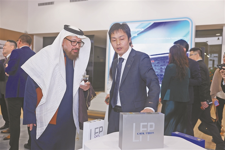 1月10日,在沙特阿拉伯利雅得“宁德”服务体验中心,宁德时代工作人员向沙特阿拉伯工业和矿产资源部首席顾问安巴萨·甘迪勒介绍中国新能源电池产品。