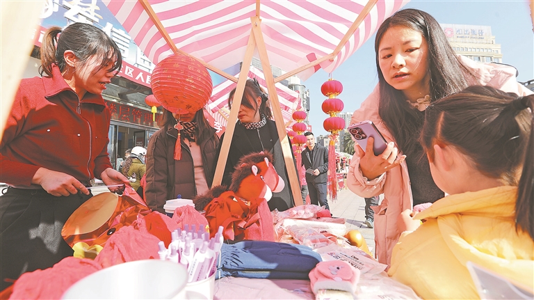共青团抚州市东乡区委联合东乡区青年企业家协会发起慈善义卖活动,通过“企业义卖+助农帮扶”的模式,募集善款资助品学兼优的困境学子。图为1月10日,在东乡区东信财富广场,人们正在各个摊位上购买物品。