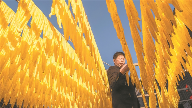 春节将至,新干县各地年货市场逐渐升温,从事地方特产制作的农民加紧生产,满足节日市场需求。图为1月10日,新干县七琴镇金龙村村民正在制作腐竹。