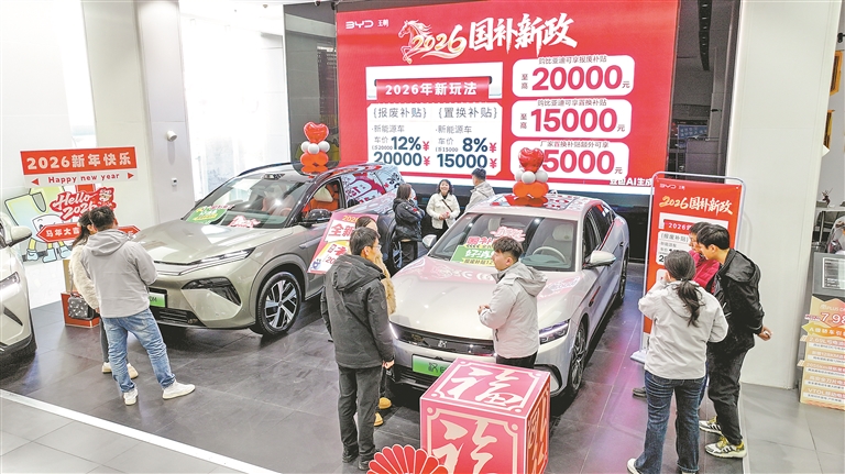 1月9日,在南昌市青云谱区三家店街道一汽车4S店,前来咨询看车、了解补贴政策的消费者络绎不绝。新年接续实施的消费品以旧换新政策正式落地,覆盖汽车、家电、数码及智能产品等多个品类,为本地消费市场注入强劲活力。特约通讯员 鲍赣生摄