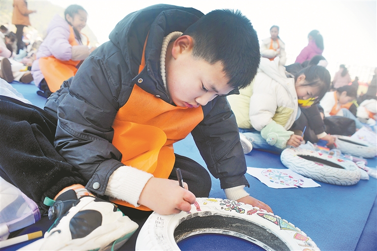 1月10日,德兴市凤凰湖铁人三项文体广场内童趣盎然,600余名孩子用画笔在废弃轮胎上作画,为即将开始的越野车旅比赛助力。 本报全媒体记者 徐黎明摄