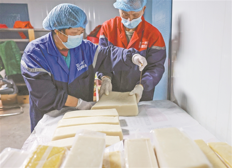 1月11日,在万年县梓埠镇的五一年糕厂,村民正将摊晾好的年糕切条整理准备销售。近年来,万年县探索“年糕+”农文旅融合发展新路径,游客可参观制作过程、体验手工切糕,有效带动周边产业。特约通讯员 徐声高摄