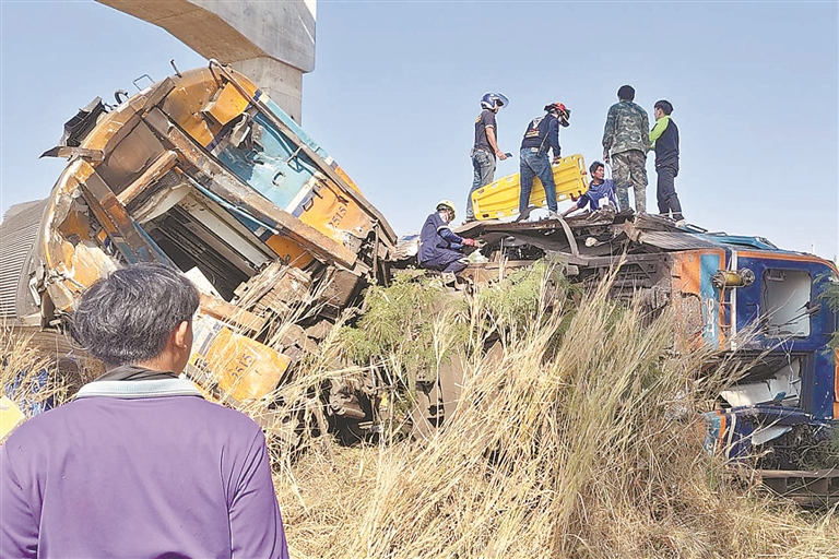 这是1月14日在泰国呵叻府拍摄的事故现场。据泰媒报道,14日上午,泰国呵叻府一台起重机在高铁项目施工过程中坠落,砸中一列正在行驶中的火车,导致车厢起火并脱轨,已造成22人死亡,另有55人受伤。新华社发