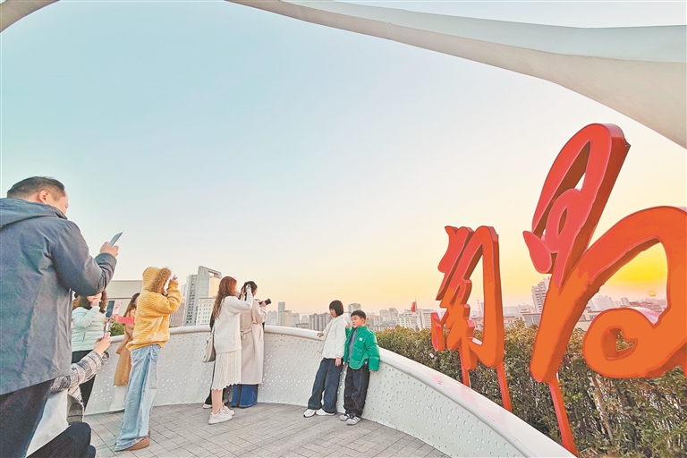 1月10日傍晚,南昌市东湖区一商场楼顶花园,市民和游客在观景平台上打卡落日景观。站在观景平台上,可观赏八一南昌起义纪念塔、江西省美术馆等地标建筑,全景式欣赏城市风景。本报全媒体记者 王蕴蓉摄