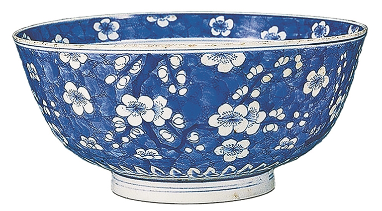 这件青花冰梅大碗(上图),是清代康熙年间的典型器物,现藏于苏州博物馆。该碗采用敞口、深腹、圈足的传统碗式,高9.5厘米,口径20厘米,胎体坚致细腻,修坯工整。碗壁以青花浓料绘制冰裂片纹,淡料晕染背景,形成“冰肌玉骨”的视觉效果。冰裂纹上绘以梅花,仿佛在严冬冰雪覆盖之时诞生新生命,寓意为生命的复苏和更新。梅花花瓣层次分明,或含苞待放,或傲然盛开,树干苍劲有力。底书“大清康熙年制”青花双圈六字二行楷书款。青花发色纯正艳丽,呈深蓝色,清新不俗。胎质细腻洁白,冰梅勾画细腻,古典优雅,韵味十足。文人常以梅花自喻,借冰梅纹瓷器表达对“风骨”的坚守。