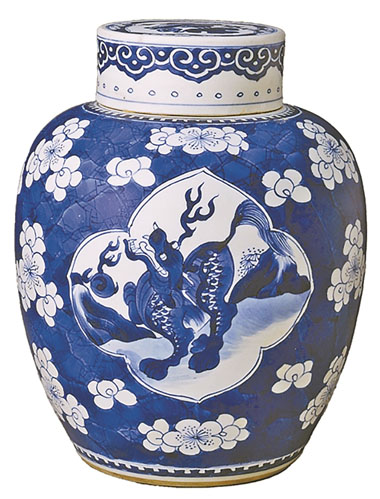 故宫博物院收藏的一件青花冰梅开光异兽图盖罐(下图),是清代康熙时期的瓷器珍品,通高为25厘米,口径8厘米,足径13厘米。其罐身上冰梅花瓣细腻生动,梅花错落有致,繁密浓烈,艳而不俗,营造出“冰天雪地映寒梅”的意境。在冰梅纹的背景上,开光(即圆形、长方形等外框)内绘制传说中的瑞兽麒麟。麒麟全身麟甲,龙头、鹿角、狼爪、牛尾,立于波涛汹涌中的岩石之上。“异兽图”的加入,打破了冰梅纹的单一性,使器物在文人雅趣中增添了皇家威严与吉祥寓意。该罐的通高、口径和足径均适中,既适合作为陈设观赏之用,也具有一定的实用性。其造型端庄、饱满,线条流畅自然,体现了康熙时期瓷器制作的精湛工艺。