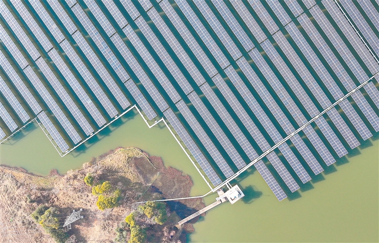 1月15日,南昌县塔城乡渔光互补光伏发电项目现场,连片的光伏板整齐排列,勾勒出一幅“板上发电、板下养鱼”的绿色生态画卷。