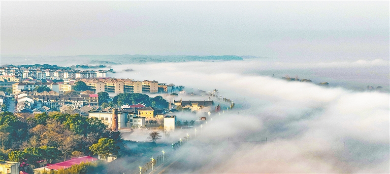 近日,永修县吴城镇晨雾漫涌,远山屋舍在雾霭中若隐若现,宛若水墨画卷,尽显这座水乡古镇的悠悠古韵与温婉意境。本报全媒体记者 梁振堂摄