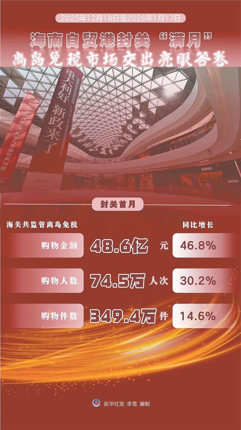 据海口海关统计,自2025年12月18日至2026年1月17日,海口海关共监管离岛免税购物金额48.6亿元,同比增长46.8%;购物人数74.5万人次,同比增长30.2%;购物件数349.4万件,同比增长14.6%。