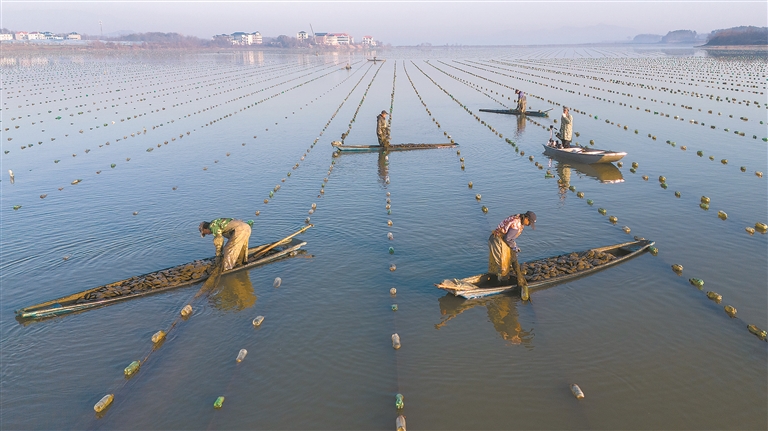 近年来,都昌县依托水资源优势,引导农民进行珍珠蚌养殖,带动农民增收。图为1月14日,在新妙湖珍珠养殖基地,蚌农正在采收珍珠蚌。 通讯员 尹志摄