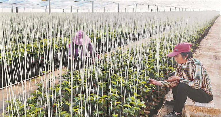 近年来,永丰县大力发展特色产业,壮大百香果、淮山药、扁萝卜等果蔬种植规模,带动村民增收。图为1月16日,恩江镇聂家村果蔬基地,农民正在新建的智能大棚培育百香果秧苗。通讯员 刘浩军摄