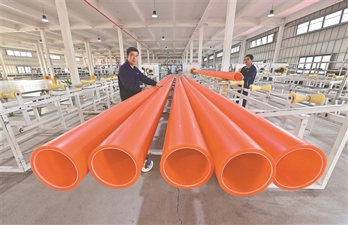 近年来,横峰县大力实施数字产业能级提升、产业数字化转型赋能等行动,通过出台政策、资金扶持等措施,推动工业经济高质量发展。图为1月16日,该县中崛电力科技有限公司生产车间,工人正在搬运电缆保护管。 本报全媒体记者 杨继红摄
