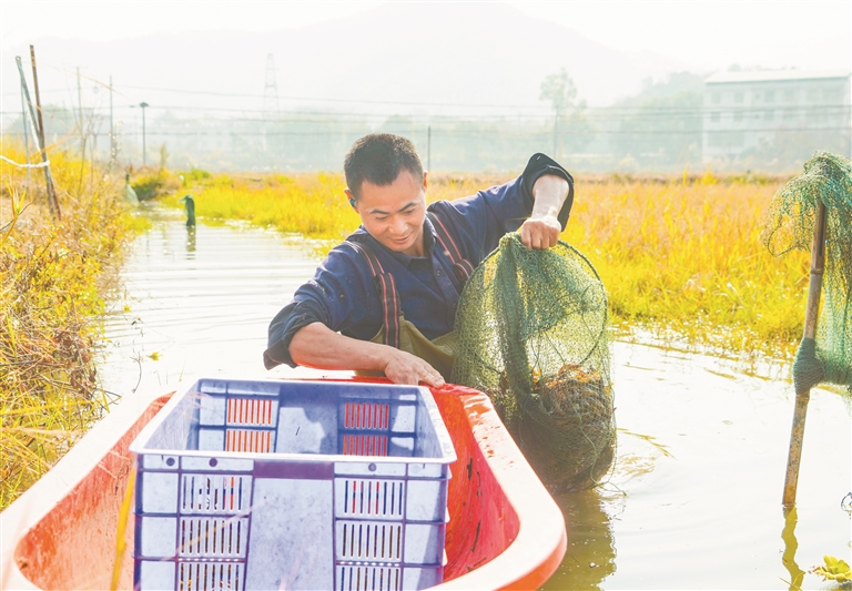 1月15日,会昌县西江镇石门村稻虾养殖基地工人在分拣小龙虾供应市场。该基地面积达600余亩,推广稻虾共养生态种养模式,实现“一水两用、一田双收”。