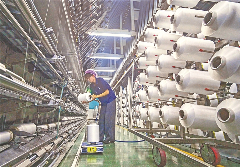 1月20日,在位于瑞金经开区的江西申华新材料有限公司加弹车间,员工取下纱锭准备装车。 本报全媒体首席记者 李 劼摄