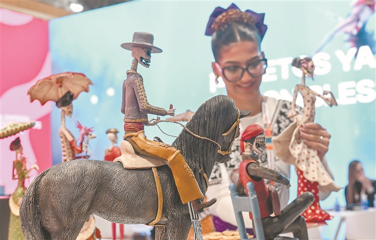 这是1月21日在西班牙马德里拍摄的墨西哥展台上的传统手工艺品。