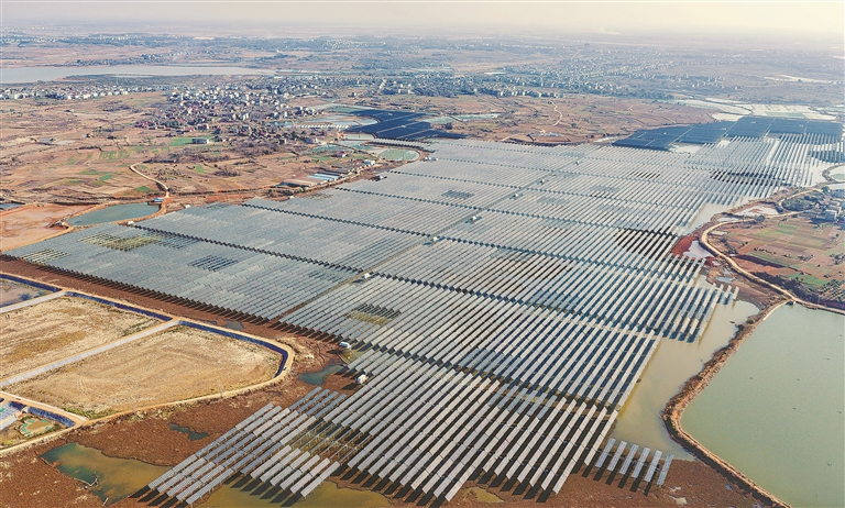 余干县立足毗邻鄱阳湖水域资源和养殖传统优势,发展“一水两用、一地双收”渔光互补项目,助力节能减排同时,促进当地经济生态双丰收。图为航拍下的瑞洪镇前山村,成片的太阳能电池板组件蔚为壮观。 本报全媒体记者 徐 铮摄