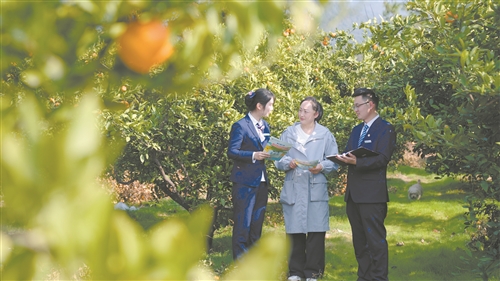 吉水农商银行工作人员走进柑橘种植园,向企业负责人宣传惠农金融政策,提供信贷服务,助力特色农业发展。 范智鹏摄