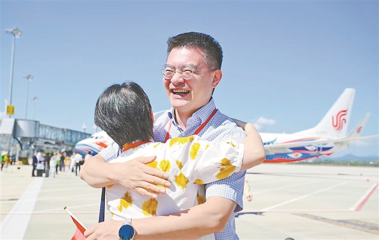 | 2025年9月28日,赣州瑞金机场正式通航,乘客下飞机后和朋友激动拥抱。该机场为方便赣南、闽西群众出行插上了“翅膀”,为区域红色旅游文化产业发展注入了新动能。本报全媒体记者 张翰林摄 |