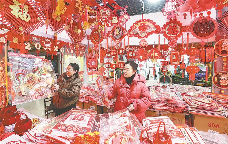 1月26日,萍乡市安源区小商品市场年味愈发浓厚,春联、“福”字、红灯笼等融入马年生肖元素的新春装饰品琳琅满目,市民穿梭其间甄选心仪好物。 特约通讯员 李桂东摄
