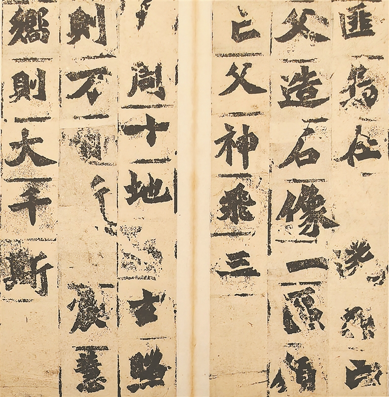 随着影印技术的不断发展,如今我们能买到的许多书法碑帖清晰度高,可谓“下真迹一等”。然而,这些影印复制件与拓片真迹原件还是有差距的。与复制件相比,拓片真迹的字口锐度高,立体感强;拓片真迹的字迹是原大(影印复制件有的缩小、有的放大)。更重要的是,这些著名碑帖的原物如钟鼎、碑碣、墓志、摩崖等,早已成了珍贵文物,不能再做新的拓片,所以我们能看到的拓片真迹都是以前的老拓片,譬如这次展出的拓片,大多为清代以前所拓。这些拓片因为时间久远而带来的古色古香的金石气息,是复制件无法比拟的。