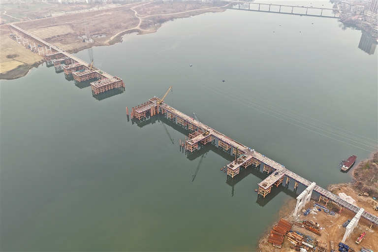 1月29日,新黄金埠特大桥建设现场的施工画面。地处余干县黄金埠镇与梅港乡境内的新黄金埠特大桥全长1193米,横跨信江,是G236芜汕线余干县黄金埠段改建工程的核心控制性工程,总投资超4亿元。该桥于2025年开工,预计2027年竣工通车。通讯员 艾世民摄