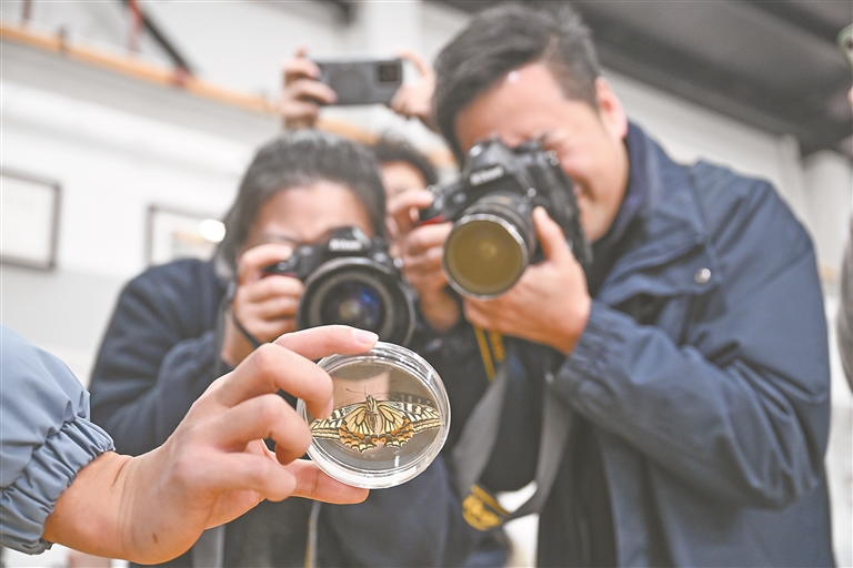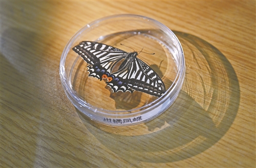 2月2日,在重庆大学深空探测联合研究中心,研究人员展示柑橘凤蝶标本。