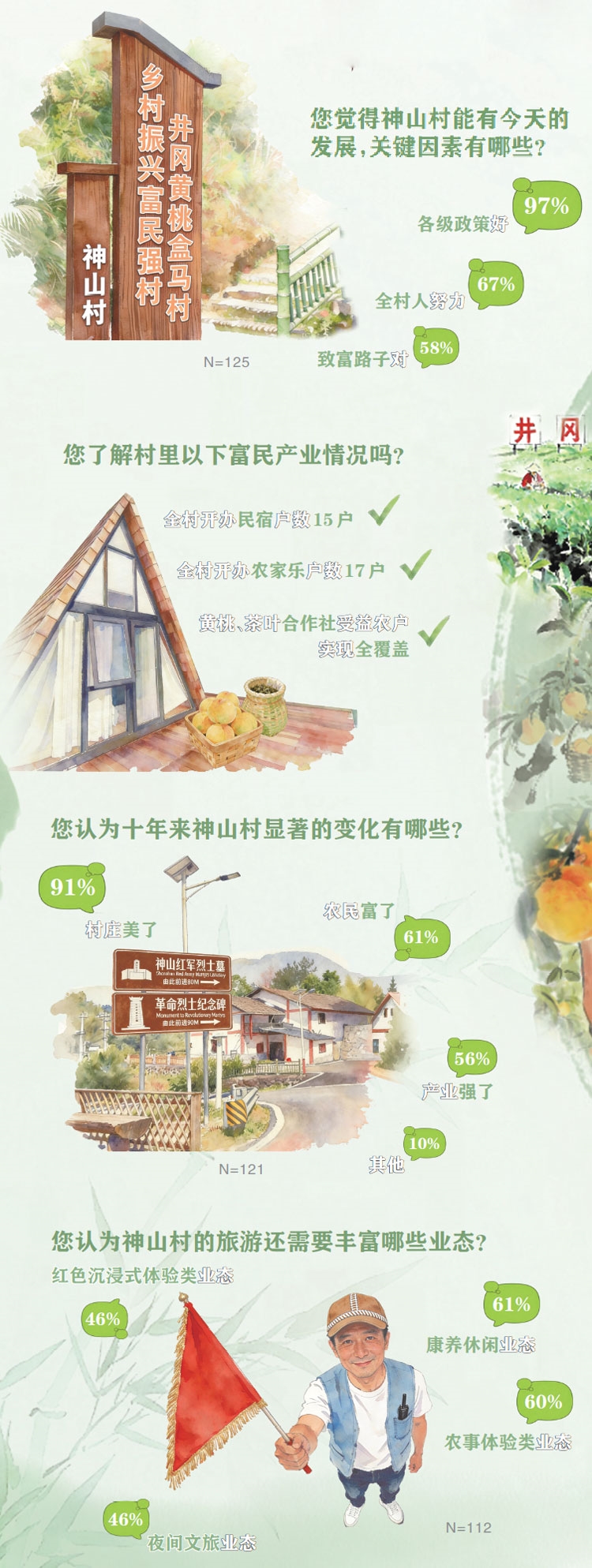 ——农村要与时俱进,现在是智能和AI时代,但咱村的步伐有点没跟上,没有能吸引年轻人的地方。我大学读的是美术专业,将来毕业后会利用所学,结合井冈山的红色元素,为村里搞些红色主题的墙绘或浮雕,同时运用新媒体方式打造和推广神山IP,吸引游客来打卡。