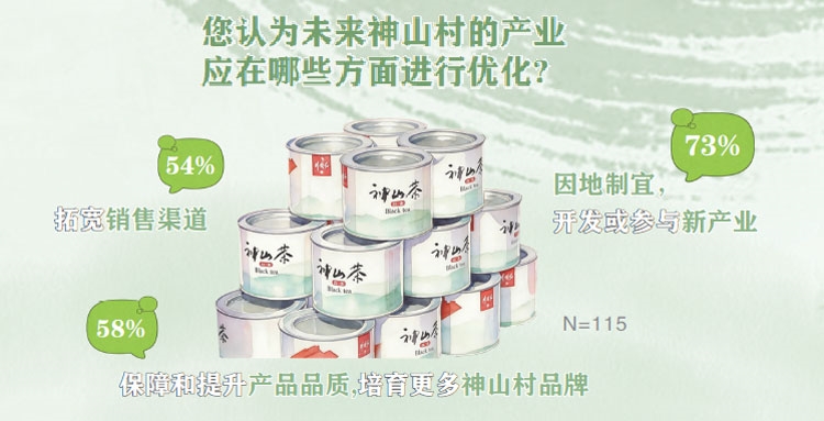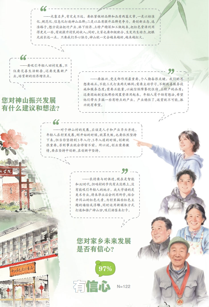 “现在国家提倡扩大内需,农村消费市场广阔。我觉得在旅游方面可以搞些休闲项目,比如神山茶文化、烧烤、露营什么的,让游客有地方坐、能聊天休息,在神山待得久一点。”“‘靠山吃山’,神山还有很多资源没有被挖掘出来,可以打造亲子活动、农事体验、红色研学等互动性强的IP项目,并通过直播去引流。”“神山最丰富的资源就是毛竹,我们要吃点苦,不能总是依赖政府投资这里、那里,要自己打造出品牌来。”
