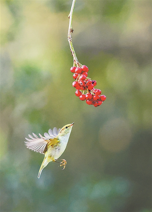 近日,在宜春市西村镇附近树林环绕的乡村池塘,各类鸟儿穿梭林间与水畔,共同谱写和谐的自然乐章。图为黄腰柳莺正悬停啄食树林中的果实。 张 龙摄