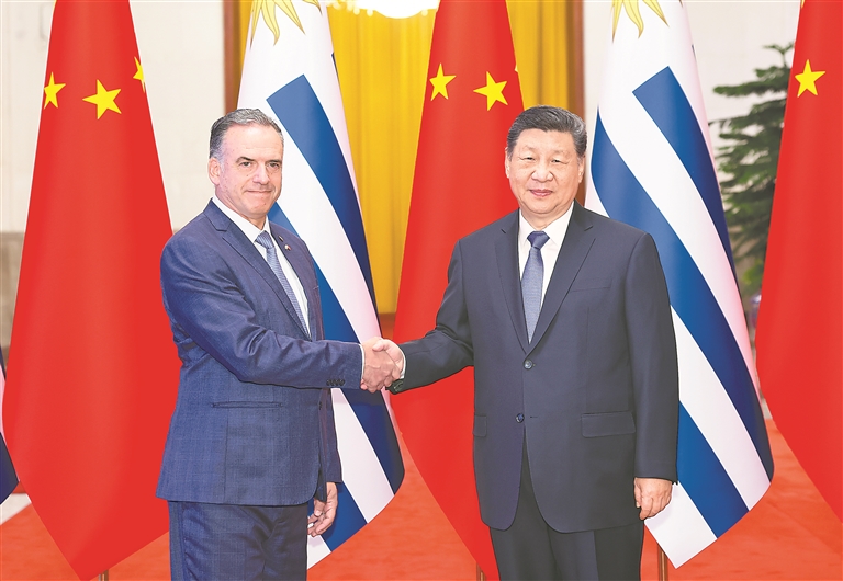 习近平指出,当今世界正处于百年未有之大变局,国际形势变乱交织,单边霸凌愈演愈烈,中方支持乌拉圭接任“77国集团和中国”轮值主席国,愿与乌方加强全球南方团结协作,共同推进平等有序的世界多极化、普惠包容的经济全球化,携手并进、共谋发展,为构建人类命运共同体作出更大贡献。中方始终重视中拉关系,支持拉美和加勒比国家维护自身主权、安全、发展利益,支持乌拉圭接任拉美和加勒比国家共同体以及南方共同市场轮值主席国,愿同乌方和地区国家推动共建中拉命运共同体走深走实。