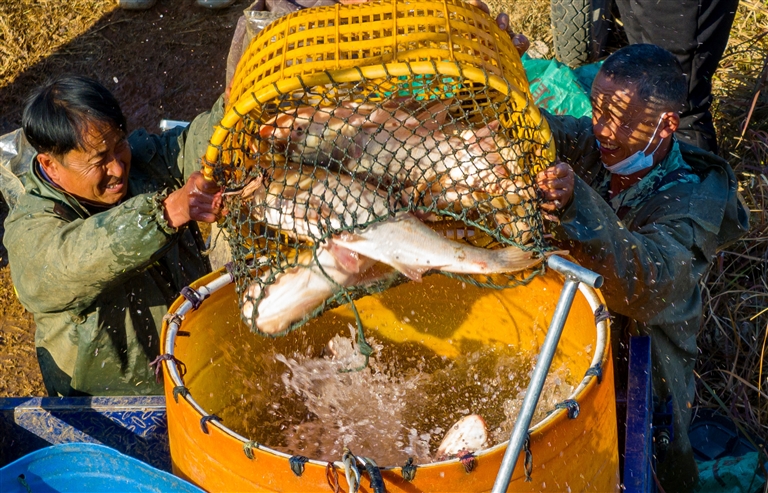 2月2日,金溪县何源镇一淡水鱼养殖基地,养殖户正在捕捞,以供应春节市场。特约通讯员 邓兴东摄