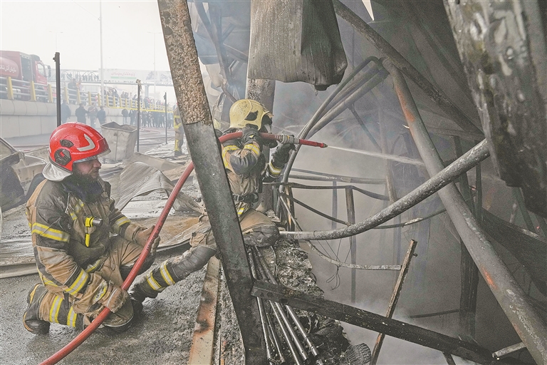 2月3日,消防员在伊朗德黑兰火灾现场灭火。