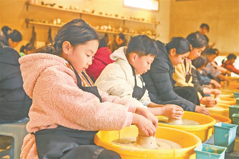寒假期间,丰城市依托文化美术馆、博物馆、非遗工坊等文化资源,广泛开展“新春非遗体验大课堂”主题活动,丰富少年儿童的假期生活。图为2月3日,孩子们在铁路镇碗泥岭非遗工坊体验洪州窑青瓷制作技艺。特约通讯员 周 亮摄