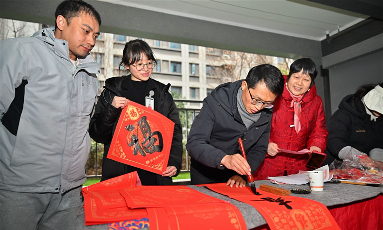 2月1日,南昌市红谷滩区龙兴街道创洲山社区,书法爱好者为社区居民现场书写春联与福字,喜迎新春佳节。本报全媒体记者 王蕴蓉摄