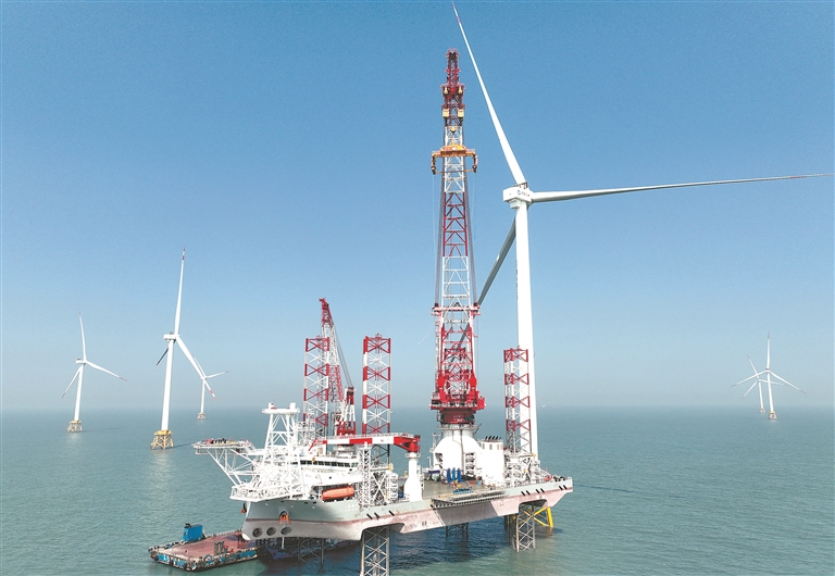 这是1月13日在闽南海域拍摄的20兆瓦海上风电机组和“大桥海风”号2000吨自升式海上风电安装平台(无人机照片)。