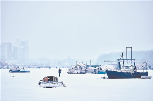 2月5日,在德国柏林,人们走在结冰的水面上。柏林持续数周遭遇寒潮,伴随降雪和冻雨。新华社/美联