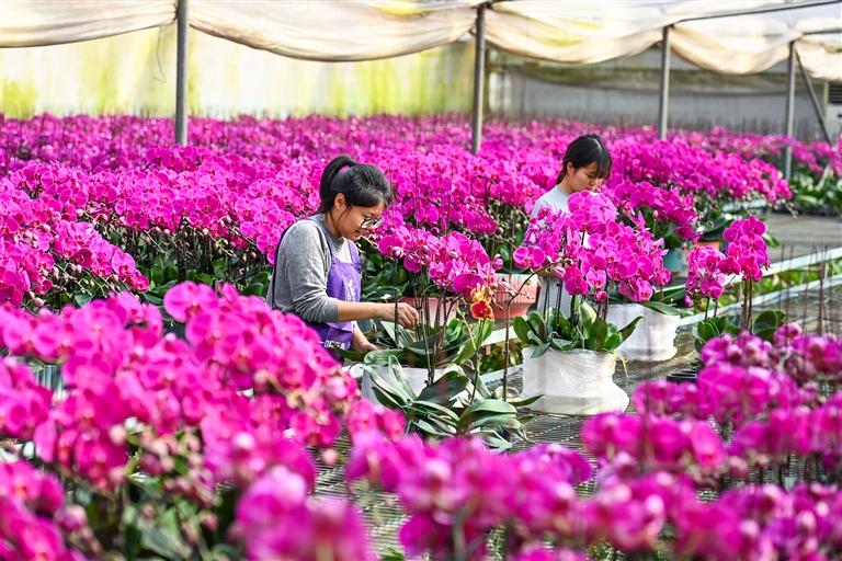 2月3日,樟树市大桥街道绿城园艺有限公司的花卉大棚内,工作人员正在分拣、包装蝴蝶兰,供应节日市场。近年来,该市大力发展花卉苗木产业,不仅丰富了市场供应,也有效带动了群众就业增收。特约通讯员 周 亮摄