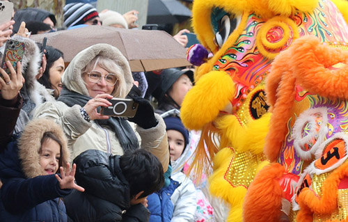 在法国首都巴黎的香榭丽舍大街,人们观看春节巡游活动上的醒狮表演。新华社发 赖思雨、张百慧编制