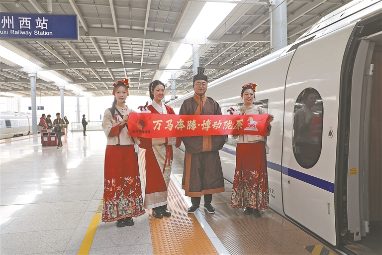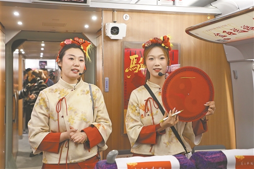 2月9日,由中国铁路兰州局集团有限公司、甘肃省文化和旅游厅、甘肃省文物局联合打造的“高铁流动博物馆”G848次列车从兰州西站发车,驶往广州南站。敦煌研究院、甘肃省博物馆等9家甘肃当地的国家一级博物馆,将陇原文脉“搬上”飞驰列车,让旅客在出行中触摸历史的温度,让传统年俗在春运车厢里焕发新彩。