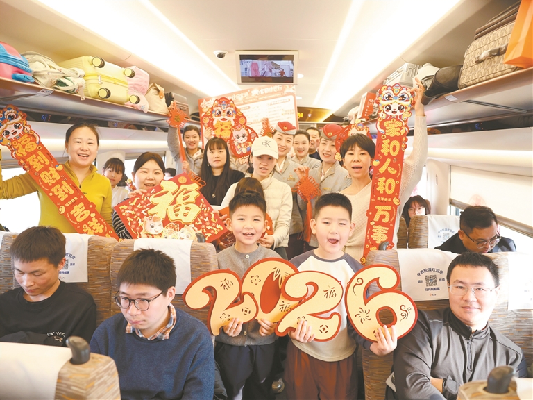 2月10日,在济南东开往广州的G415次列车上,工作人员与旅客合影留念。