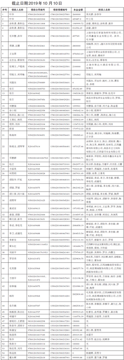 前述债务已全部逾期,上述债务人已构成违约,请相关义务人立即履行还款义务或承担担保责任。(表中金额仅列明本金,部分债务虽剩余本金为0,但存在利息未结清。本金截止日期2019年10月10日,所有的利息、复利、罚息、违约金等按借据、合同约定及国家规定或法院规定或法院裁定文书裁定另行计算,已履行部分还款的债权金额按照相应的合同约定、法院裁定及国家规定的还款顺序处理)。