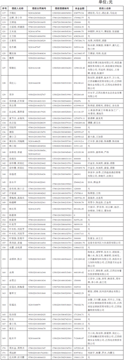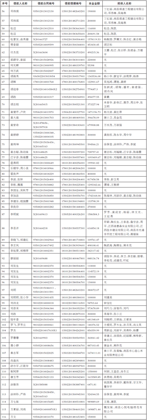 根据中国长城资产管理股份有限公司江西省分公司(以下简称“我司”)(原名:中国长城资产管理公司南昌办事处)与原债权人中国民生银行股份有限公司南昌分行签署的《资产转让协议》,以及借款人、担保人与原债权人中国民生银行股份有限公司南昌分行签署的借款合同和担保合同,原债权人中国民生银行股份有限公司南昌分行对借款人和担保人所享有的债权由我司承继并享有。请债务人、担保人或其承继人立即向我司履行还款义务或承担担保责任(若借款人、担保人因各种原因发生更名、改制、歇业、吊销营业执照或者丧失民事主体资格等情形,请相关承债主体、清算主体代为履行义务或者承担清算责任)。(见下表)